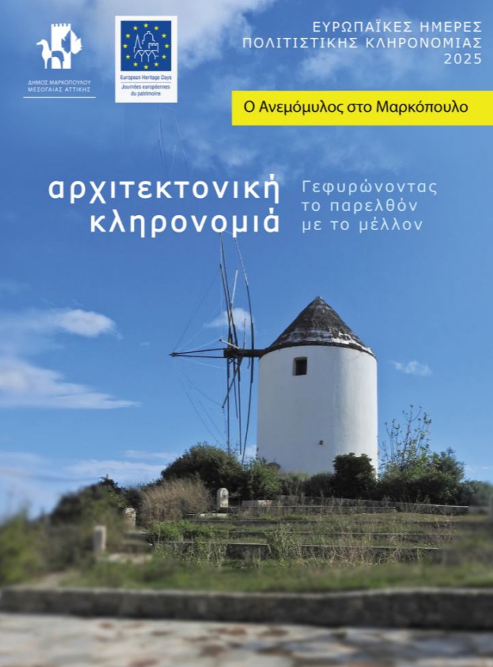 Στο πλαίσιο των Ευρωπαϊκών ημερών πολιτιστικής κληρονομιάς, ο Δήμος Μαρκοπούλου Μεσογαίας Αττικής διοργανώνει εκδήλωση με τίτλο “Ο ανεμόμυλος στο Μαρκόπουλο. Αρχιτεκτονική κληρονομιά, γεφυρώνοντας το παρελθόν με το μέλλον”.